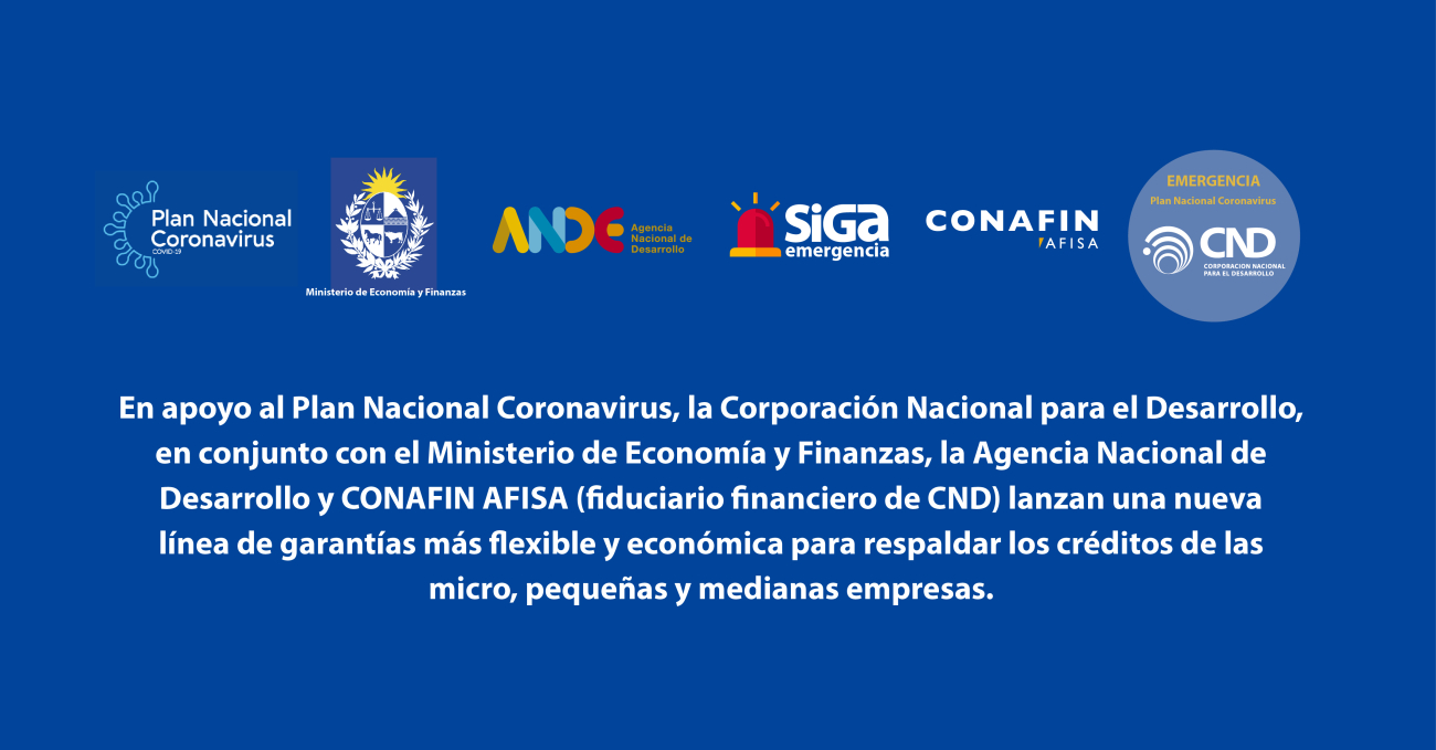 Ante las medidas de apoyo anunciadas como consecuencia de la emergencia sanitaria declarada por el Poder Ejecutivo en marzo de 2020, la Corporación Nacional para el Desarrollo, en conjunto con el Ministerio de Economía y Finanzas, la Agencia Nacional de Desarrollo y CONAFIN AFISA (fiduciario financiero de CND) lanzan una nueva línea de garantías más flexible y económica para respaldar los créditos de las micro, pequeñas y medianas empresas.