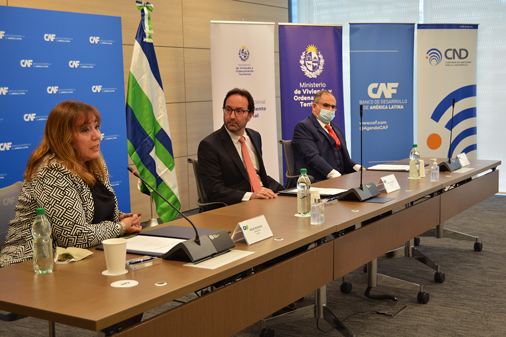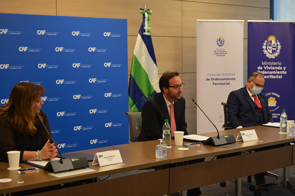 El acto de la firma, que tuvo lugar en la sede de la CAF en Montevideo, contó con las palabras de la Ministra del MVOT, Dra. Irene Moreira, el Vicepresidente de CND, Ángel Fachinetti y el representante de la CAF en Uruguay, François Borit.