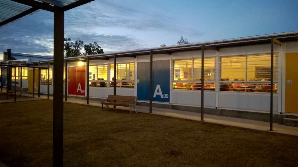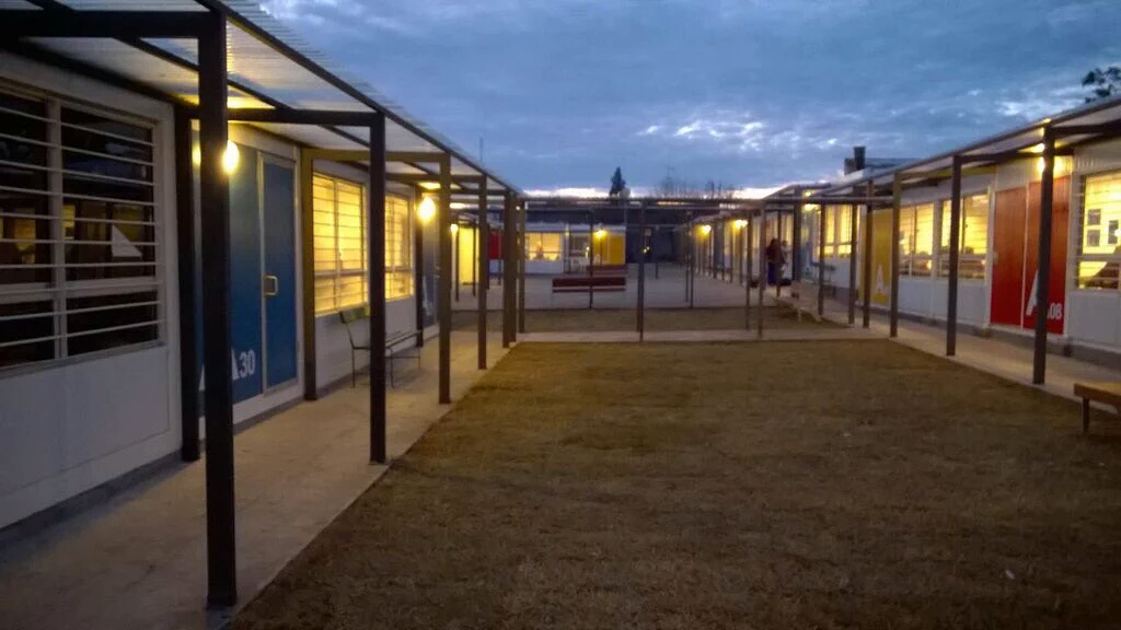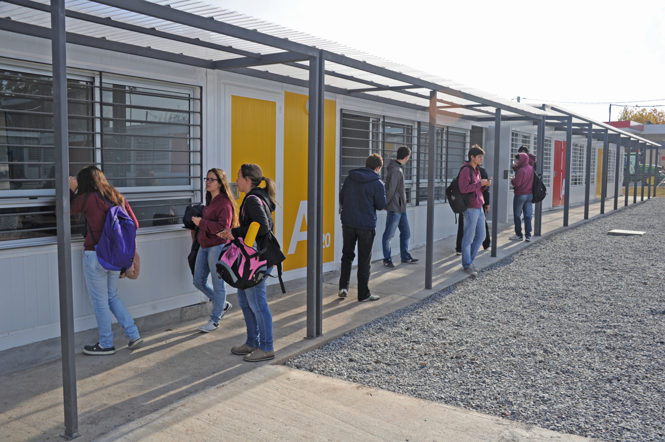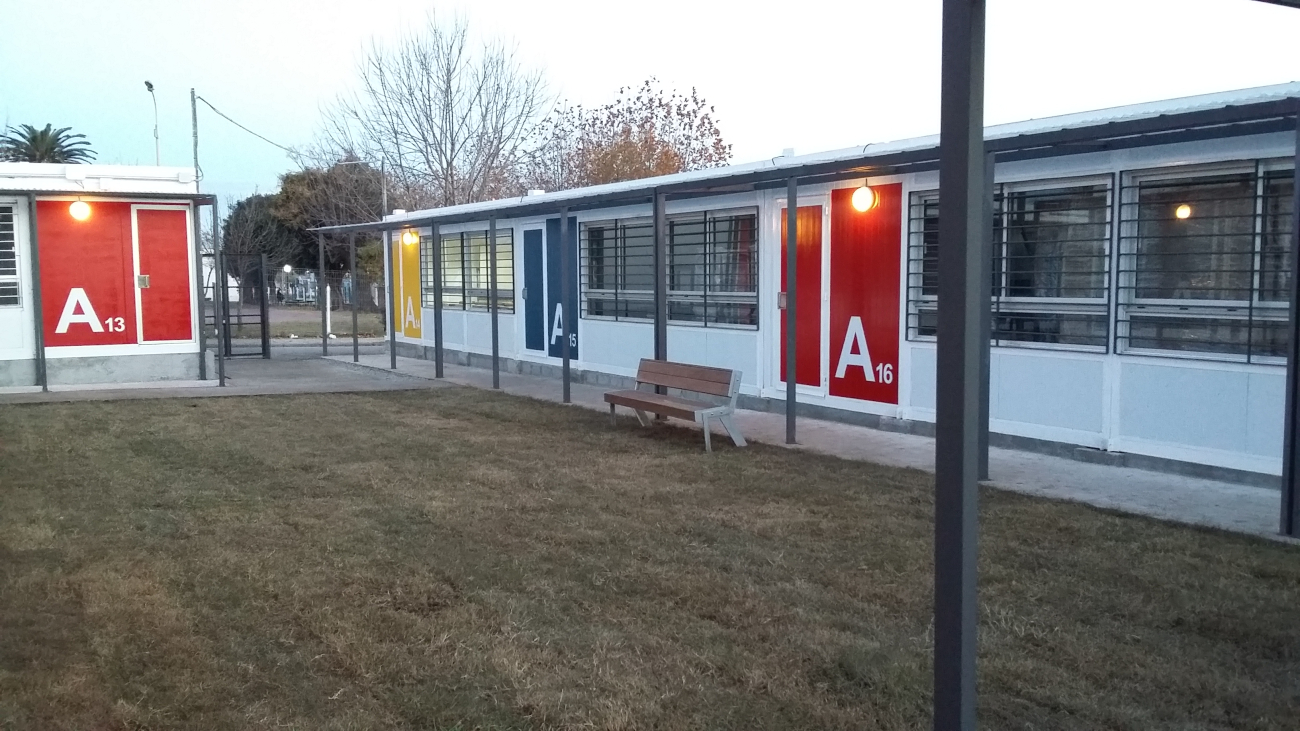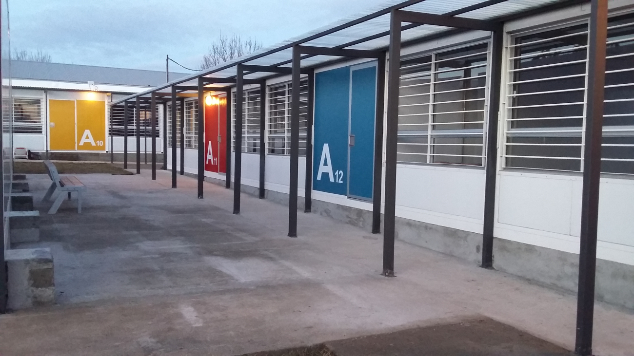 El 29 de abril comenzó la ejecución del conjunto edilicio, que se conforma por 32 aulas prefabricadas y 5 módulos de baños que suman un total de 1.500 m2 de espacios cerrados más 400 m2 de galerías techadas y pavimentos. Dentro de estos espacios se previó también la instalación de locales especializados como laboratorios y áreas administrativas.