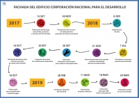Fachada Fachada del edificio de CND Presentamos línea de tiempo de los avances en la fachada del edificio de la Corporación Nacional para el Desarrollo a través de esta infografía. Galería de imagenes