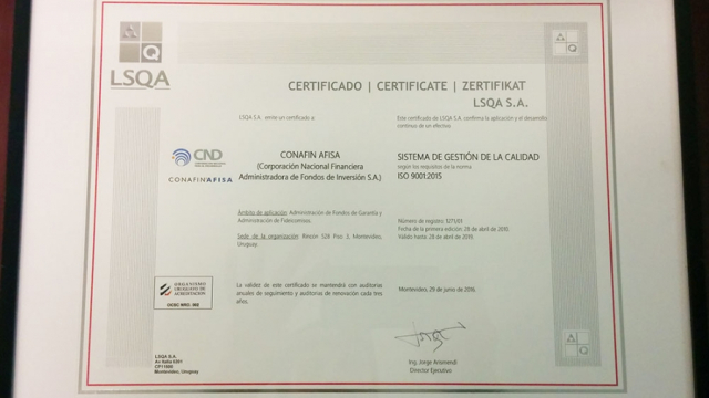 Conafin Afisa recibió de parte de LSQA y Quality Austria los certificados correspondientes a la certificación 2016 del Sistema de Gestión de Calidad bajo la norma ISO 9001:2015.